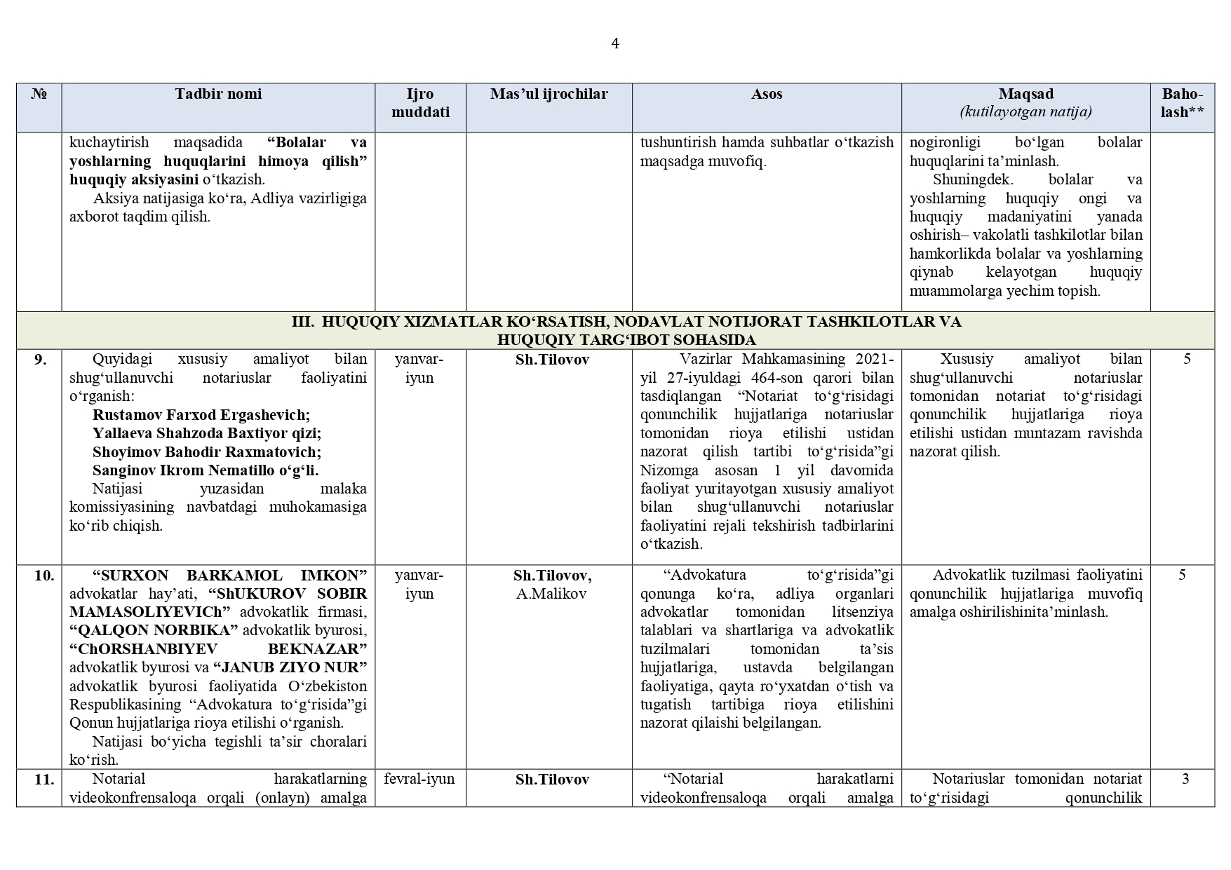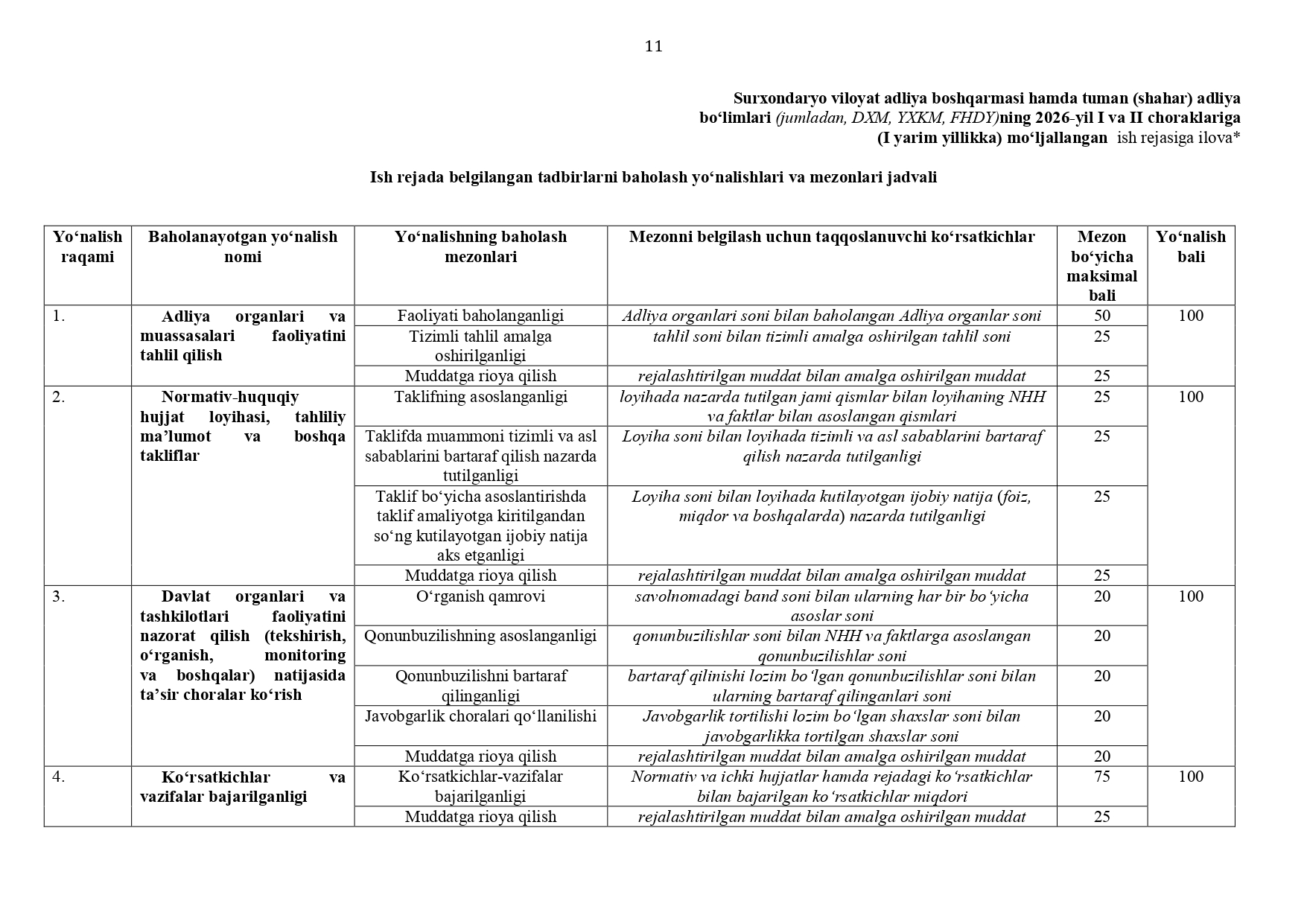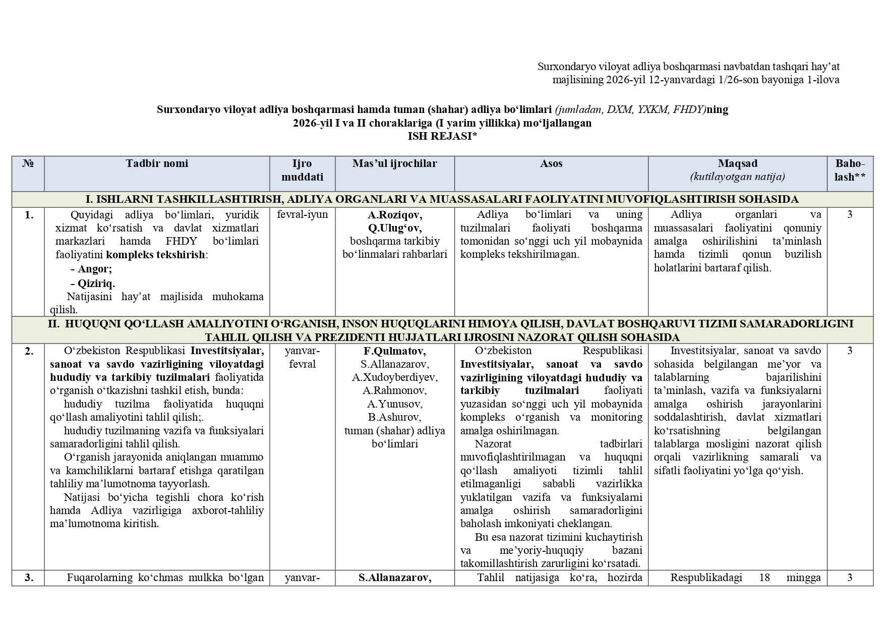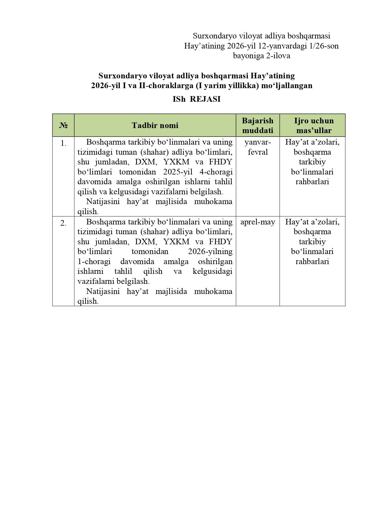 Surxondaryo viloyat adliya boshqarmasi hamda tuman (shahar) adliya bo‘limlari (jumladan, DXM, YXKM, FHDY)ning 2026-yil I va II choraklariga (I yarim yillikka) mo‘ljallangan ISH REJASI