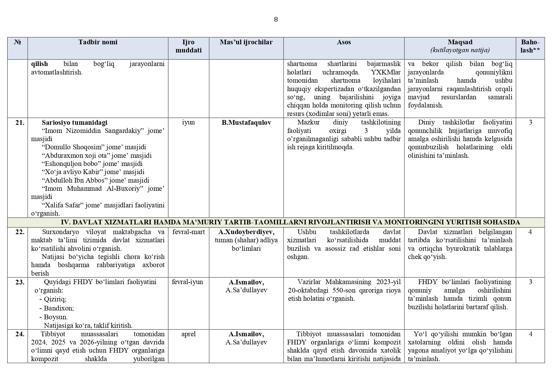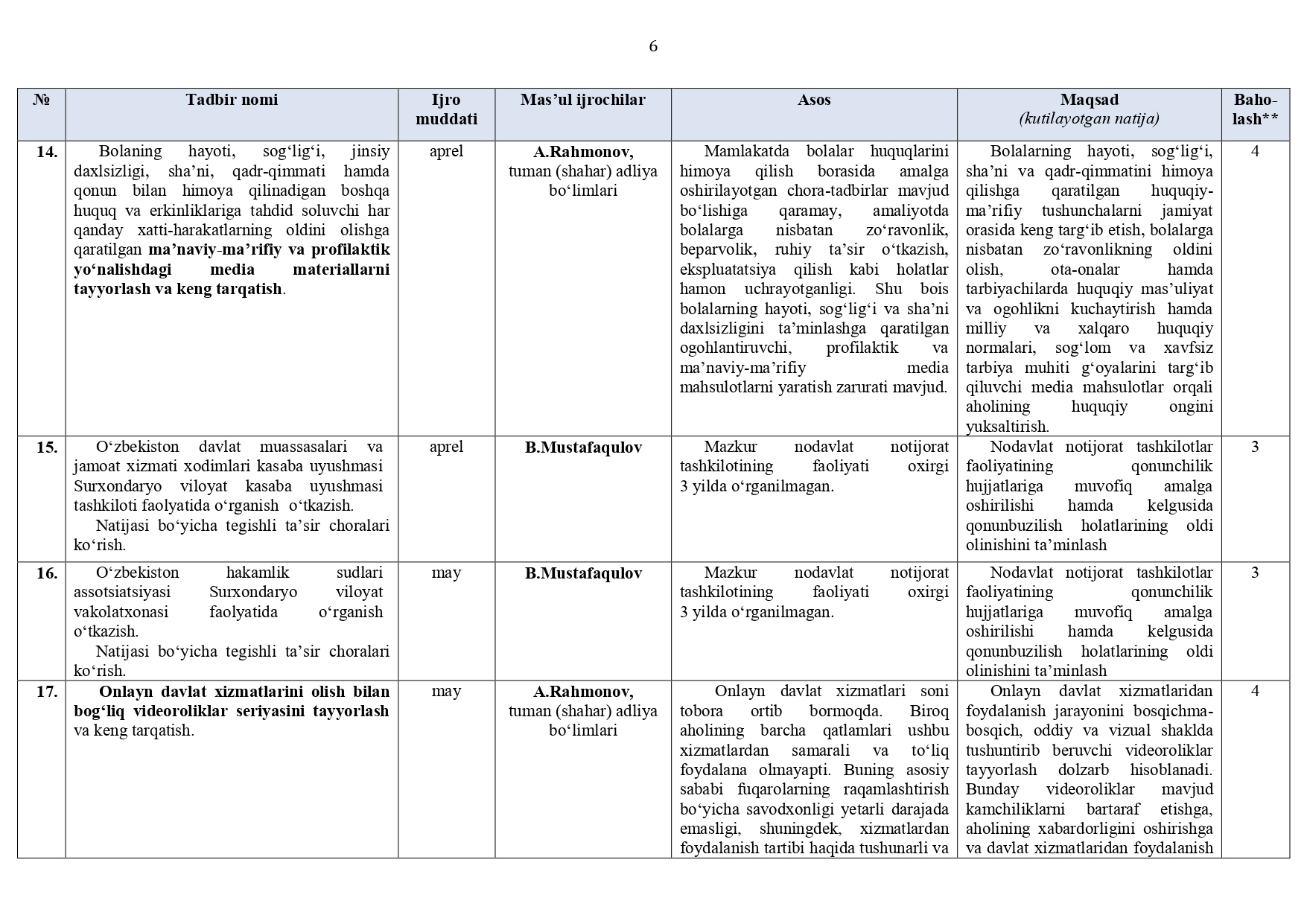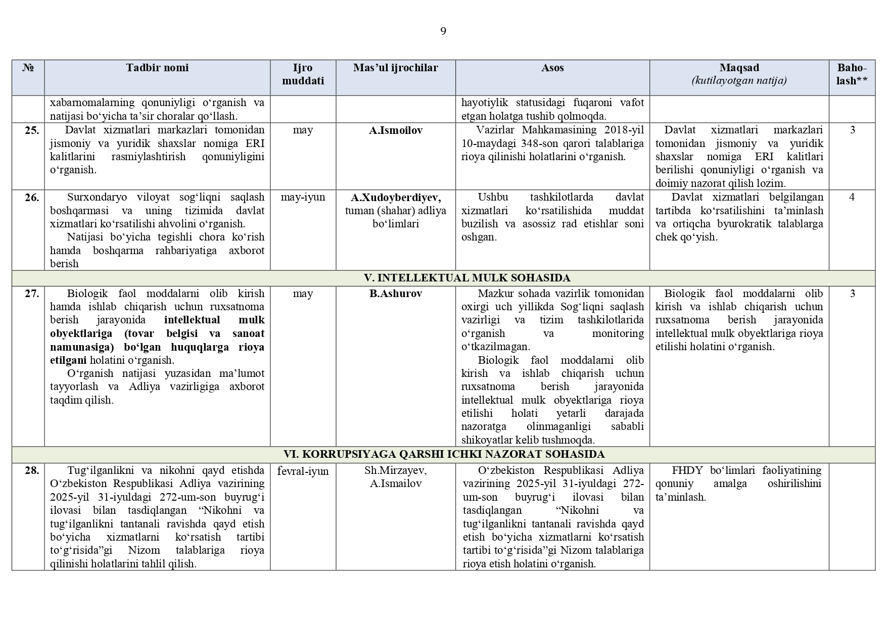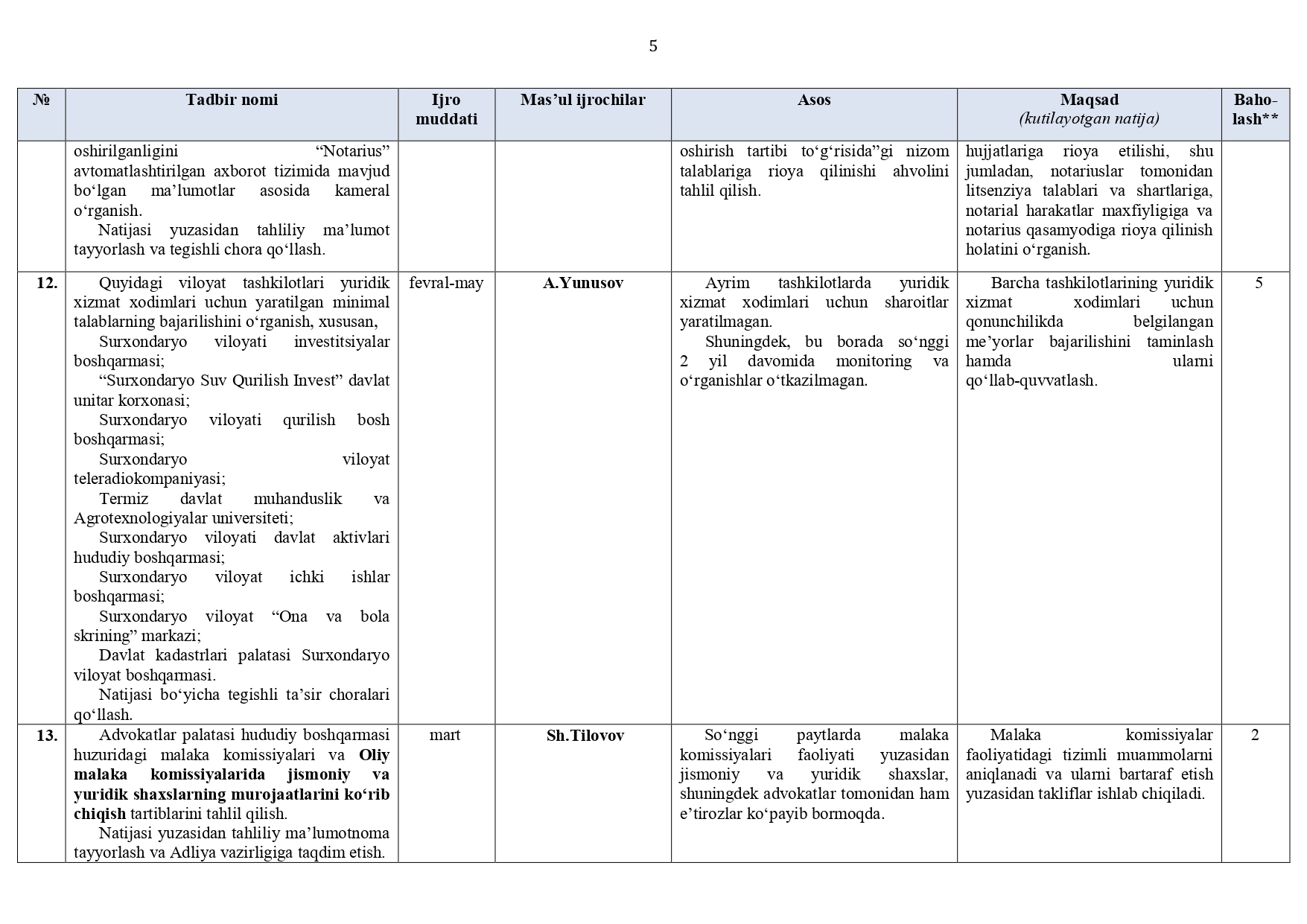 Surxondaryo viloyat adliya boshqarmasi hamda tuman (shahar) adliya bo‘limlari (jumladan, DXM, YXKM, FHDY)ning 2026-yil I va II choraklariga (I yarim yillikka) mo‘ljallangan ISH REJASI