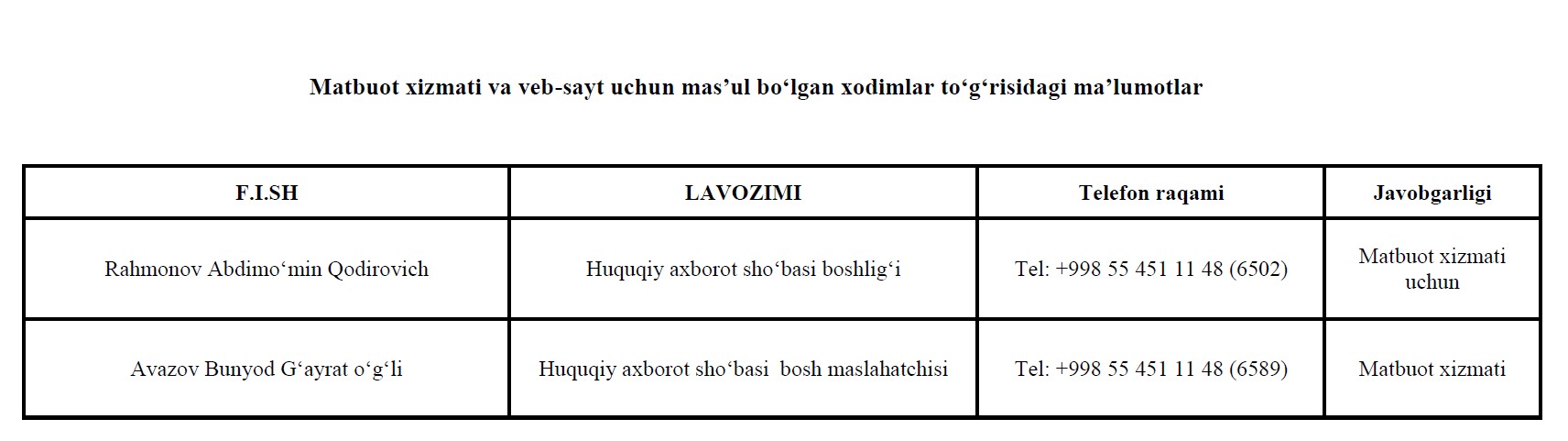 Matbuot xizmati va veb-sayt uchun mas’ul bo‘lgan xodimlar