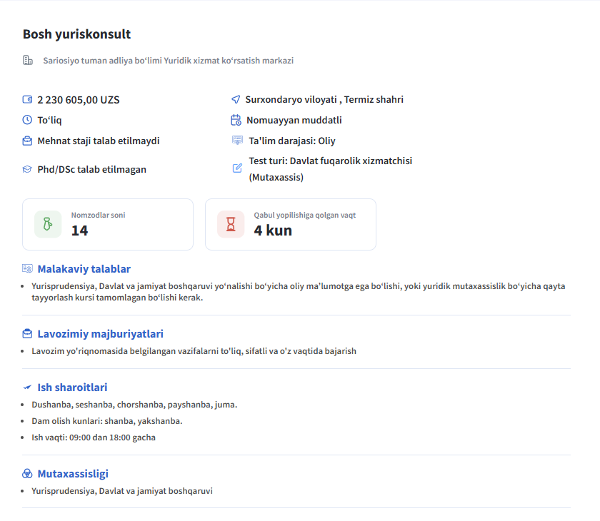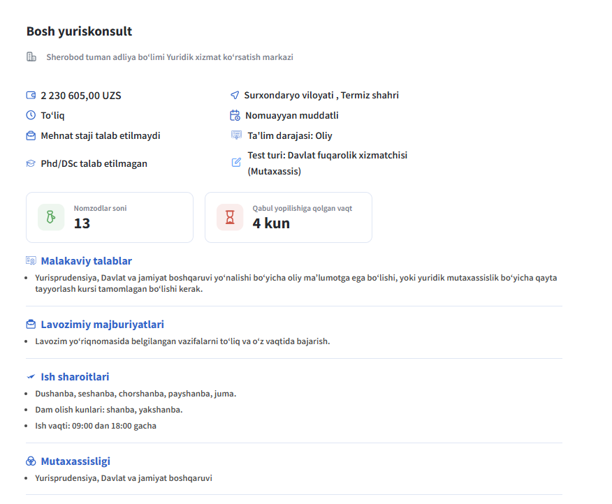 Ishga qabul qilish boʻyicha tanlov shartlari va batafsil maʼlumotlar bilan ushbu manzil orqali tanishishingiz va shu manzil boʻyicha elektron tarzda hujjat topshirishingiz mumkin: