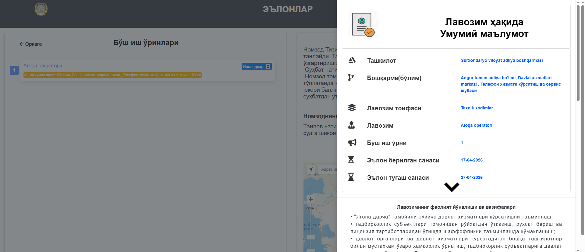 Ishga qabul qilish boʻyicha tanlov shartlari va batafsil maʼlumotlar bilan ushbu manzil orqali tanishishingiz va shu manzil boʻyicha elektron tarzda hujjat topshirishingiz mumkin: https://vakansiya.adliya.uz/vacancy/1672#